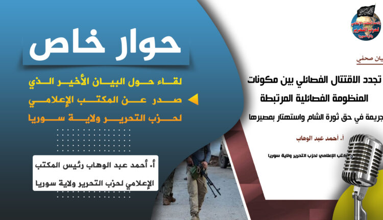 حوارات حوار خاص: لقاء حول البيان الأخير الذي صدر عن المكتب الإعلامي لحزب التحرير ولاية سوريا بواسطة Radio Admin في 1444/03/24م شارك حوار خاص: لقاء حول البيان الأخير الذي صدر عن المكتب الإعلامي لحزب التحرير ولاية سوريا أ. أحمد عبد الوهاب رئيس المكتب الإعلامي لحزب التحرير ولاية سوريا Your browser does not support the audio element. شارك FacebookTwitterGoogle+ReddItWhatsAppPinterestالبريد الإلكتروني