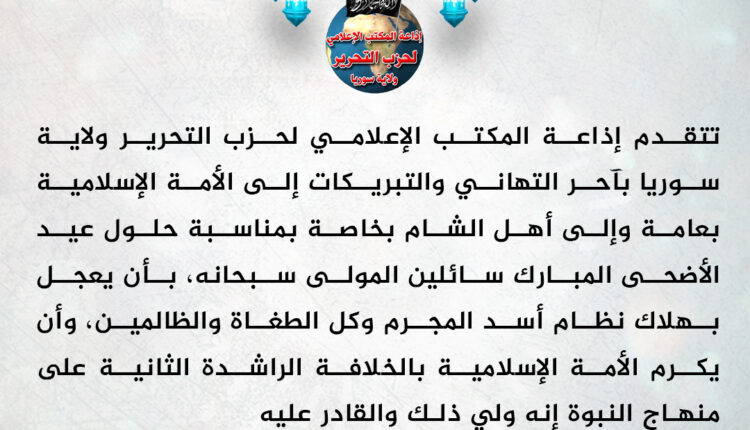أعياد تهنئة إذاعة المكتب الإعلامي لحزب التحرير ولاية سوريا بمناسبة حلول عيد الأضحى المبارك 1444 هـ بواسطة Radio Admin في 1444/12/09م شارك شارك FacebookTwitterGoogle+ReddItWhatsAppPinterestالبريد الإلكتروني